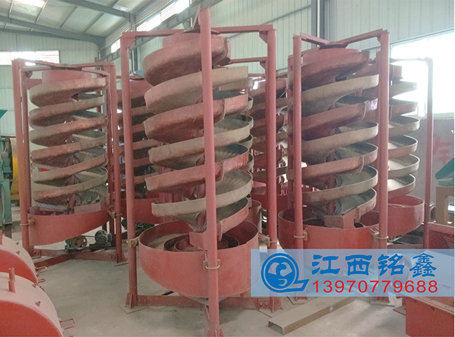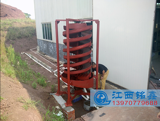 促使給礦更快的分帶,輕、重礦物運動軌跡差異明顯,分選效果優(yōu)于一般固定螺旋溜槽或螺旋選礦機。富集比高,有效分選粒度范圍為0.6~0.05毫米,粒度回收下限略高于螺旋溜槽。