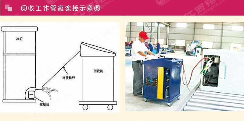 利用壓縮機將制冷系統(tǒng)的制冷劑回收到設備內(nèi)過濾、干燥、分離潤滑油,壓縮成氣態(tài)制冷劑,進入冷凝器冷卻成液態(tài),儲存到工作罐中,等待重新利用。這樣既保護了環(huán)境,又增加了經(jīng)濟效益。