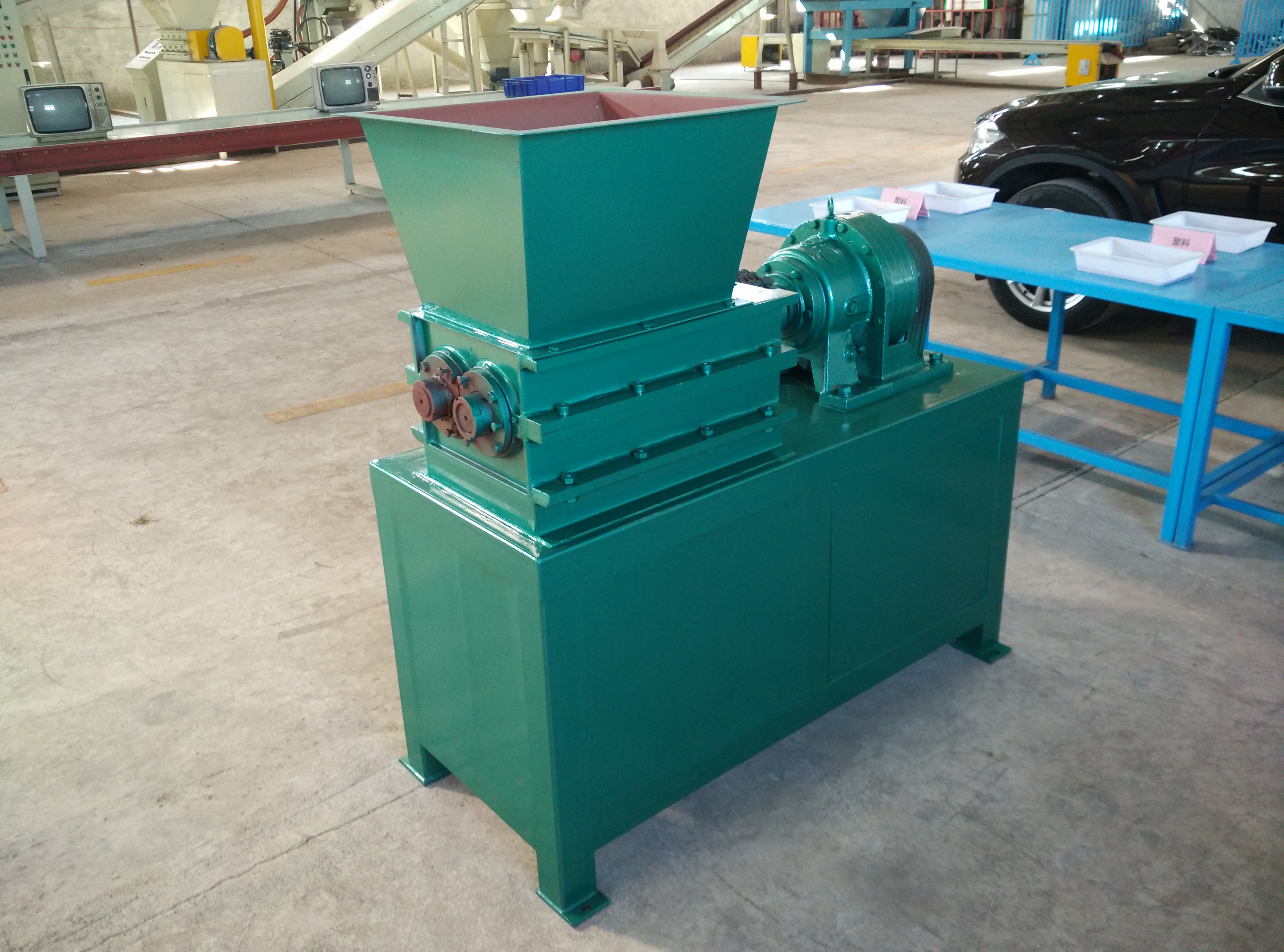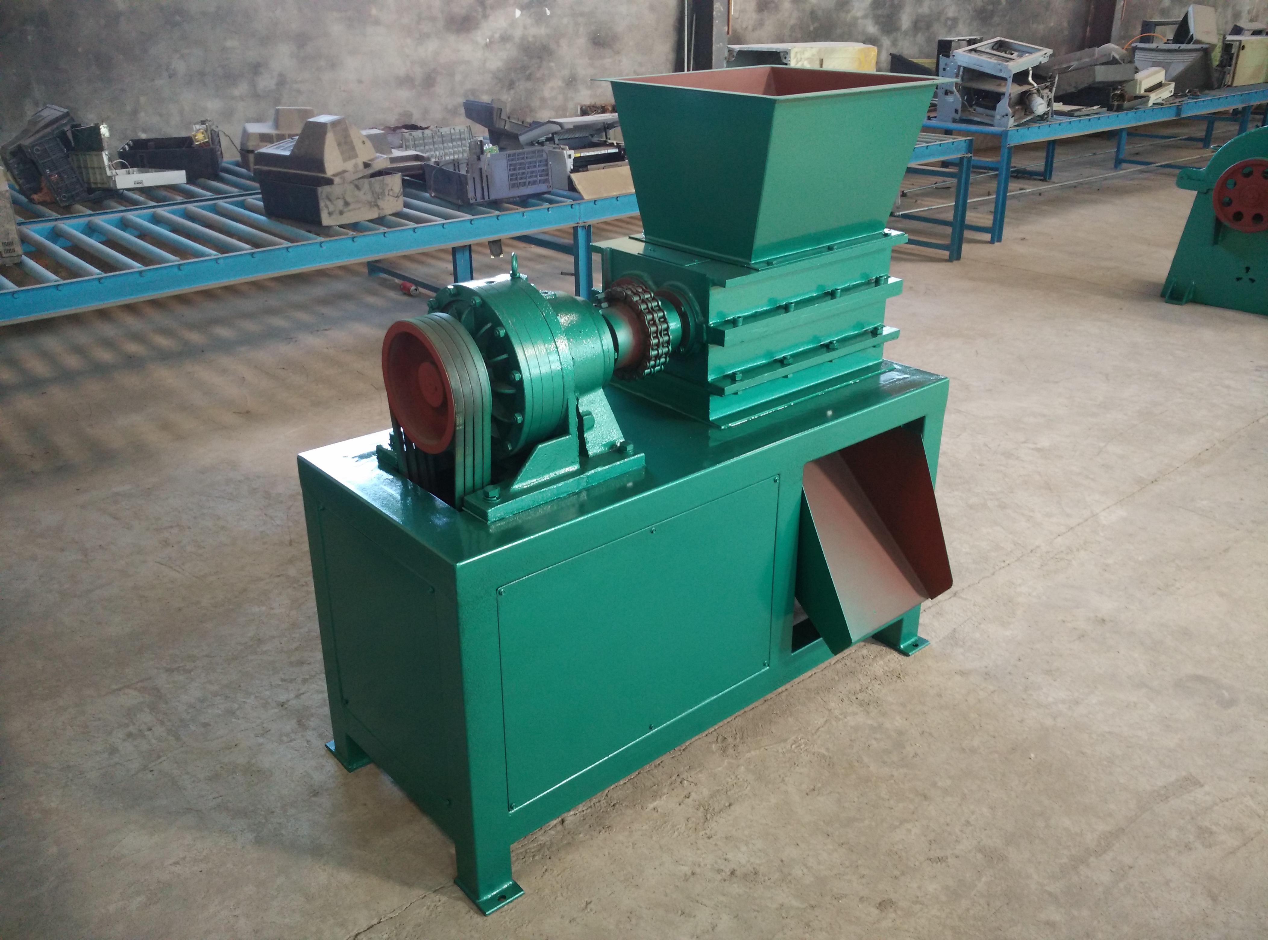 該機(jī)設(shè)計(jì)新穎、噪音低、扭矩大、用途廣,在破碎過程中,具有拉切、扯斷、擠壓、自動退料,能使各種塑料、廢電線、電纜、印刷電路板、廢舊冰箱、洗衣機(jī)、空調(diào)、電視、電腦等家電及打印機(jī)、復(fù)印機(jī)、傳真機(jī)等辦公用品。廢舊橡膠、工程樹脂、城市廢物、木材、管材、粗大塊料破碎之用,每小時處理量1-10噸。