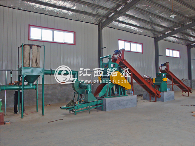 MX600型智能破碎機(jī)進(jìn)行粗破 ---> 皮帶機(jī)輸送(磁選機(jī)除鐵) ---> MX500型干式銅米機(jī)細(xì)破(可加除塵系統(tǒng)) ---> MX1200型干式分選機(jī)分選出(粗、中、細(xì)銅米) ---> 風(fēng)壓吸塑機(jī)將塑料(包含雜質(zhì)和毛絲銅粉塵等)吸入聚料斗中 ----> 專(zhuān)用螺旋輸送 ---> 專(zhuān)用水選床水選
